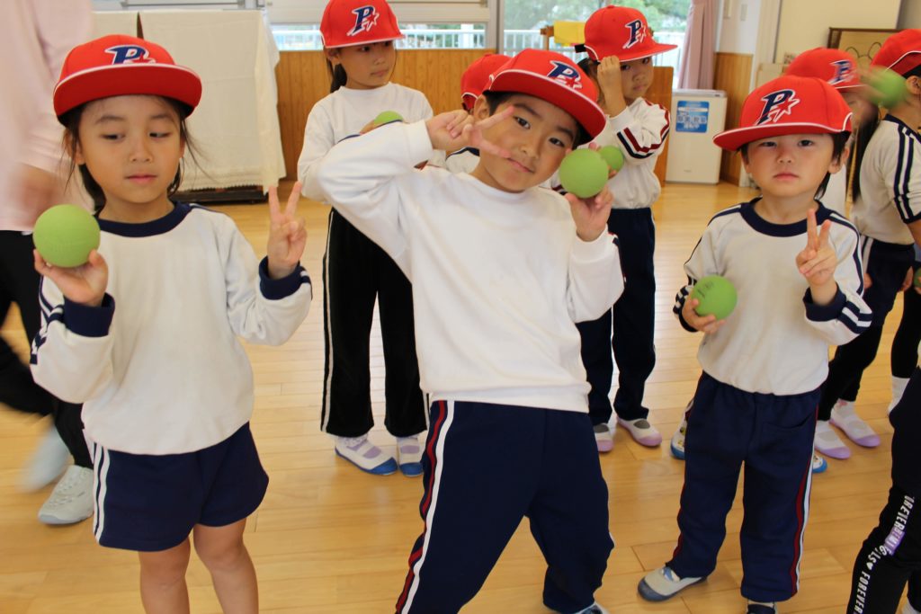 今日は野球教室で、キッズ野球(ティーボール)教室の方が来てくれました!帽子を被ることができて嬉しそうな子どもたち♪