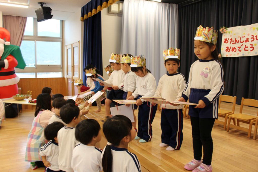 みんなが楽しみにしていた誕生会♪ホールには、クリスマスの飾り付けがされてあり、みんなワクワク・そわそわ!キンカン・レモンなど季節の草花の紹介や12月生まれのお友だちをみんなでお祝いしました☆