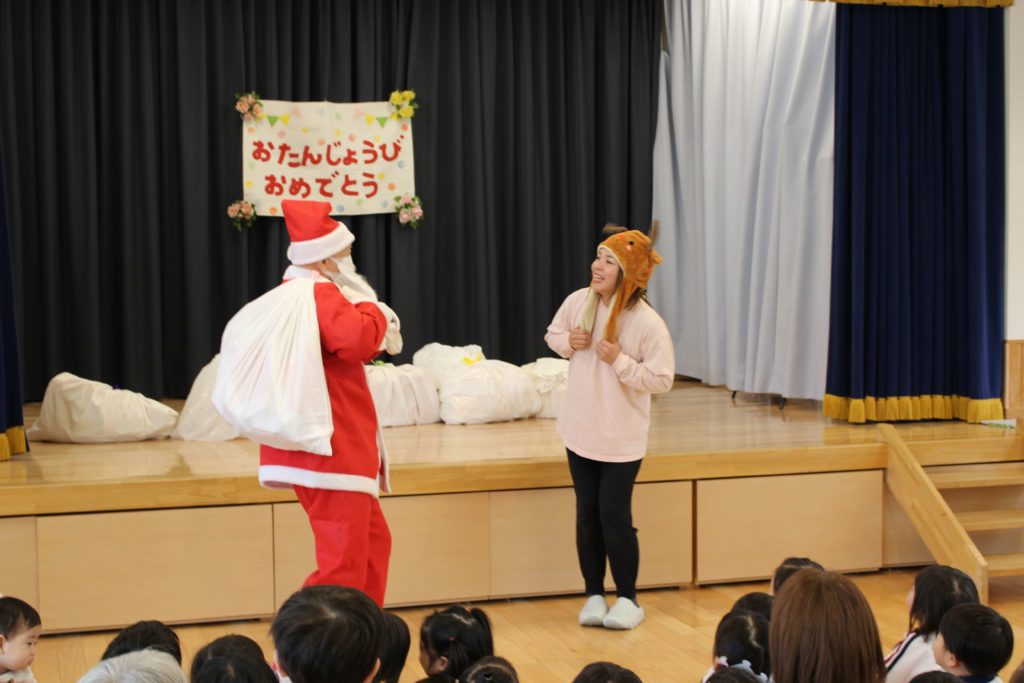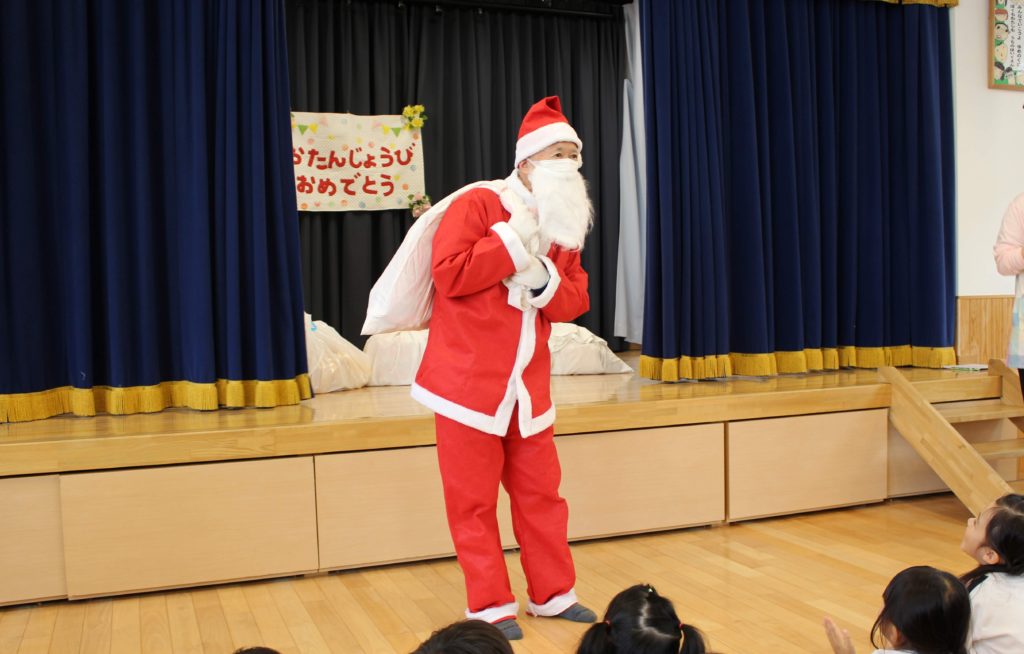 すると音楽に合わせてサンタクロースが登場!!内野保育園のお友だちのためにプレゼントを持ってきてくれました♪プレゼントの袋をみて「うわぁ~♡」と大喜びでしたよ!