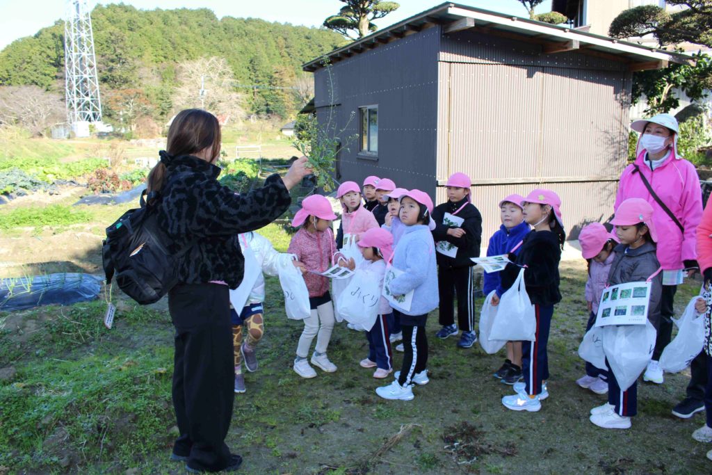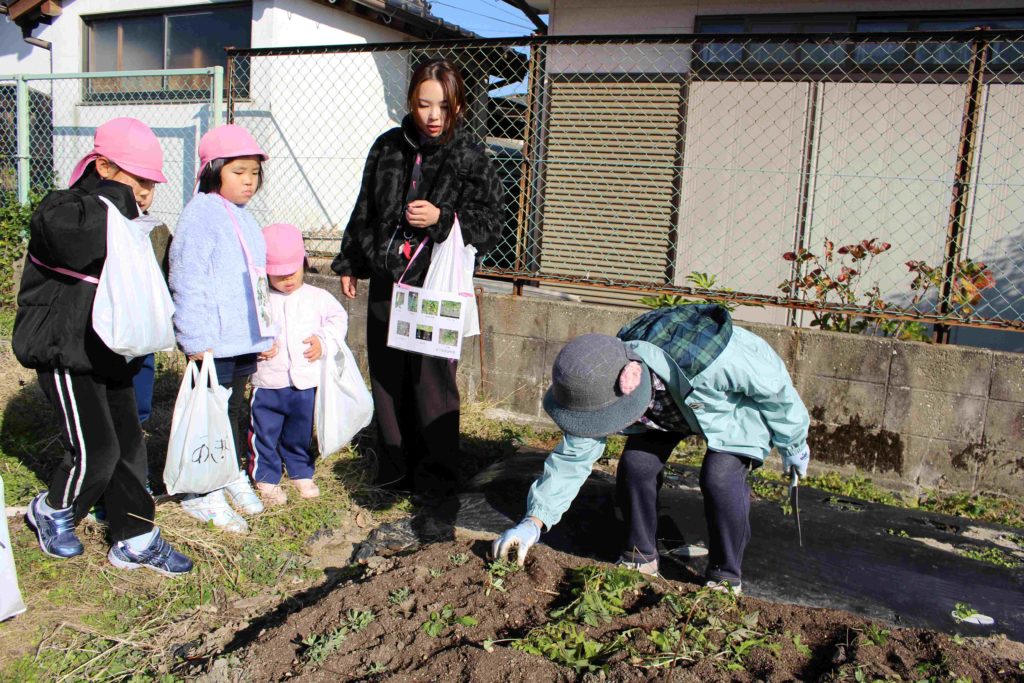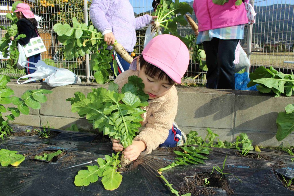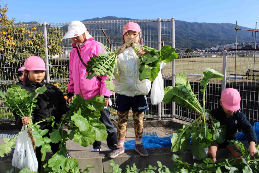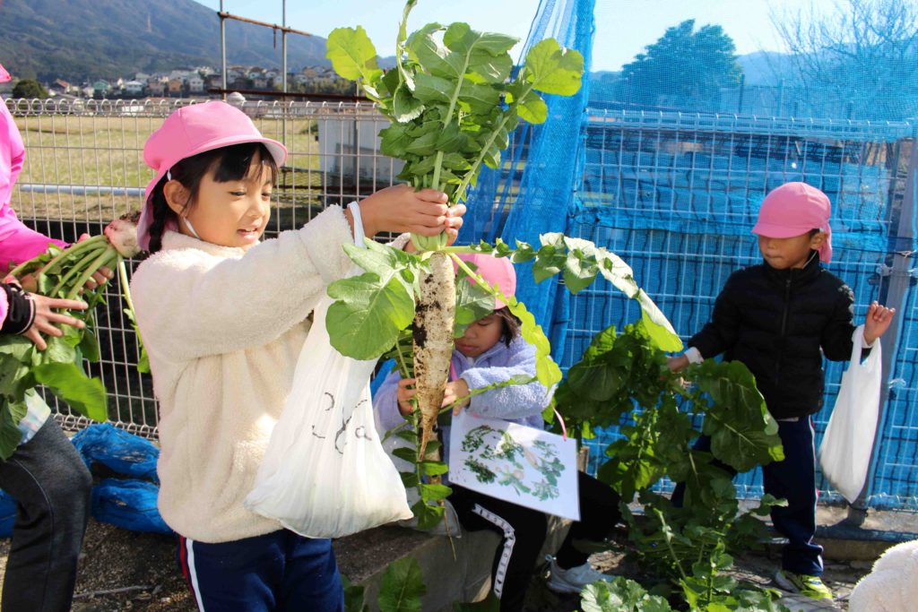最後に保育園の畑で育てていた大根(すずしろ)とかぶ(すずな)を収穫して、無事に『春の七草』が揃いました♪