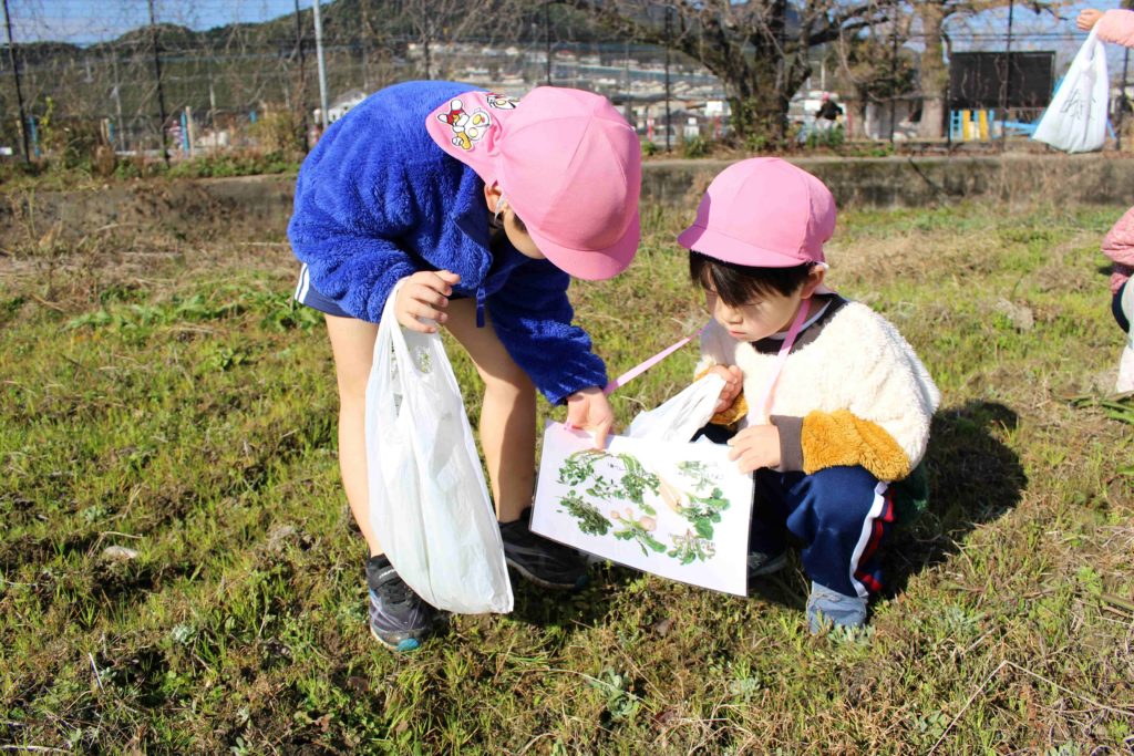 「せんせ~い!これはなに!?」と聞いたり、「あと2個で全部揃うね!」と七草の写真を見ながら積極的に探したり、見つけると大喜びの子どもたちでした☆