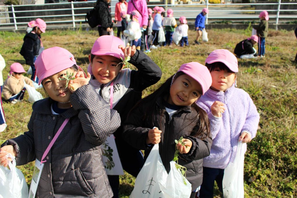 今日は、さくら組さんが七草を摘みに行ってきました!細川先生に七草の種類を教えていただきながら、細川先生の畑や保育園周辺の畑など目をキョロキョロ…させながら探していましたよ!