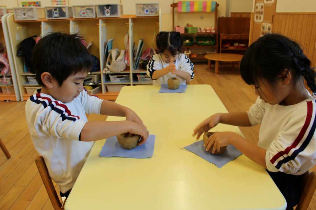 陶芸教室を楽しみにしていた子どもたちはとても真剣な顔で粘土の扱い方の説明を聞いたり、魔法のスポンジを使ってひび割れをキレイにしたりと取り組んでいました!粘土の感触を楽しみながら、お皿やコップを一生懸命つくっていましたよ♪