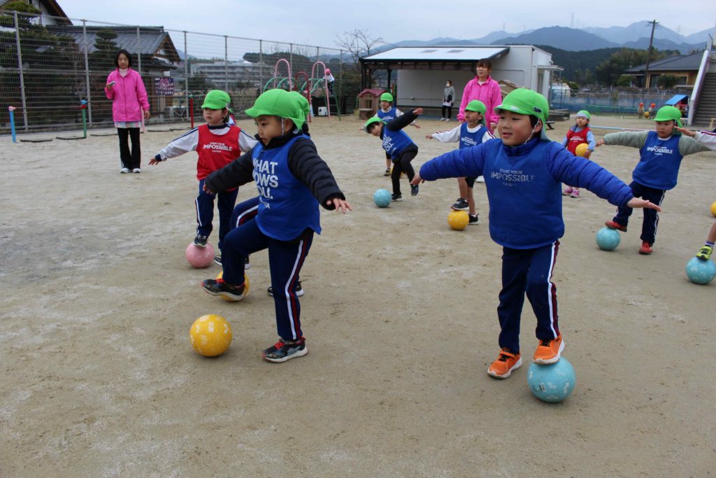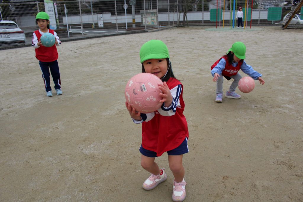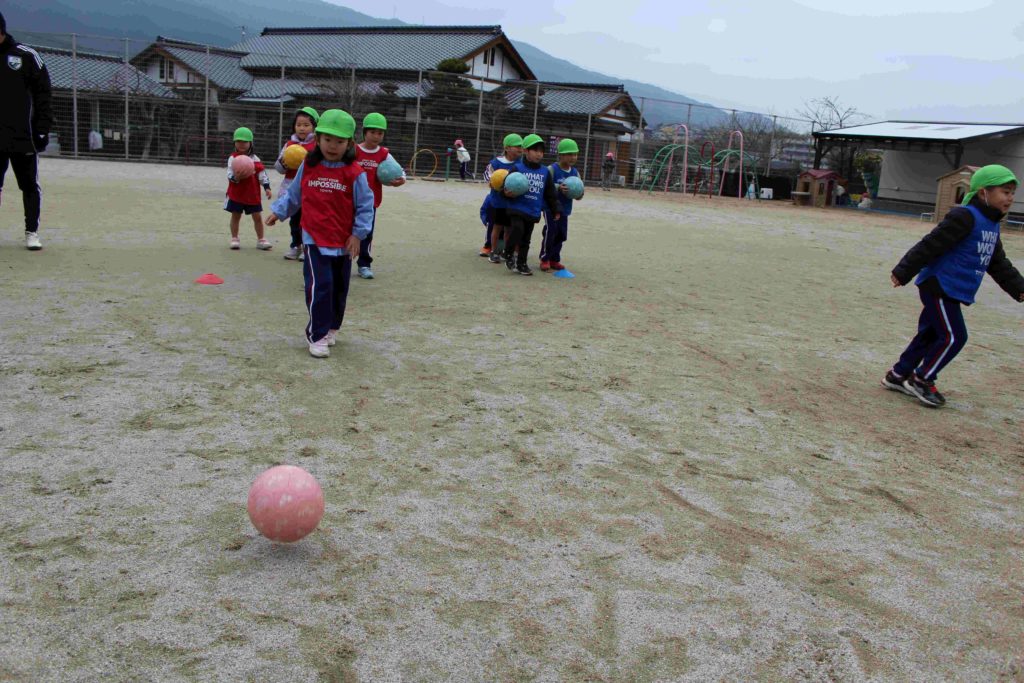 今日は福岡県サッカー協会から、ひまわり組さんにサッカーを教えに来てくれました!元気よく挨拶をした後は、1人1つずつボールをもらい、足の周りで転がしたり、高く上げてキャッチしたりしてボールにたくさん触れて体を動かしました☆